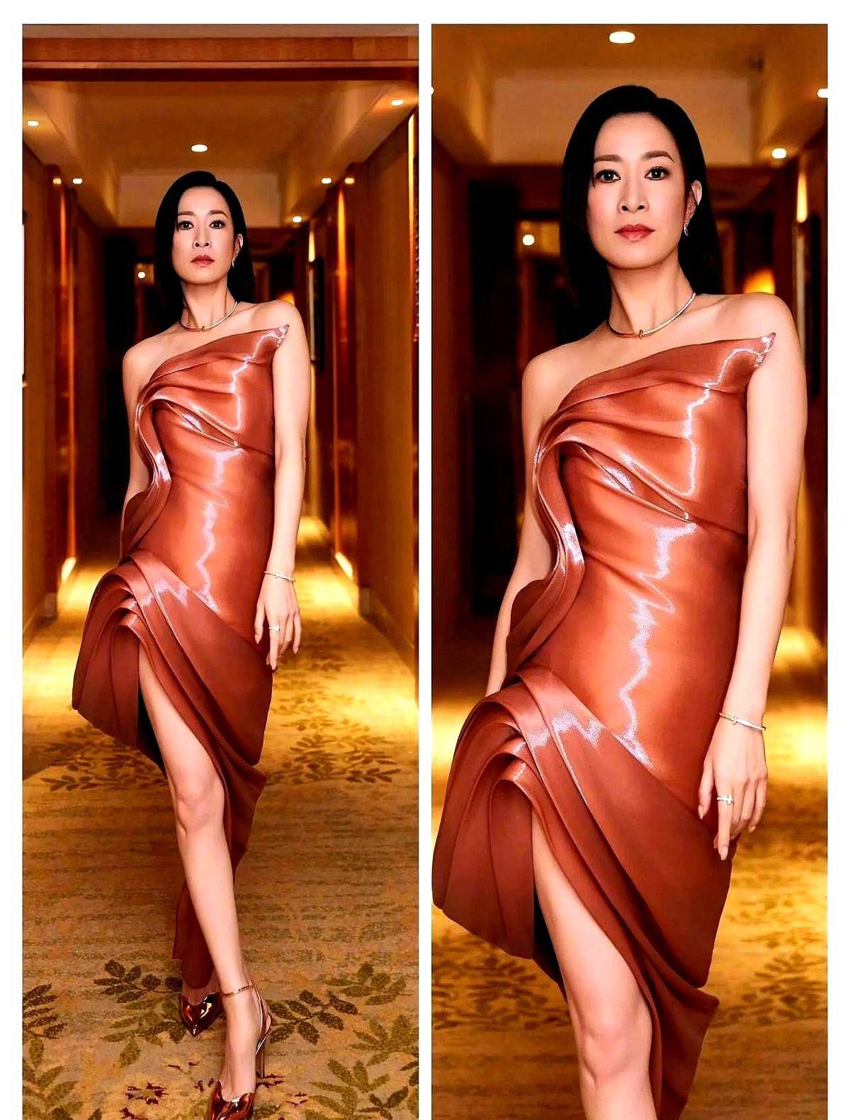 要知道佘诗曼从来不是循规蹈矩的人。早在上个月她就用黑色荷叶长裙搭配修身西装惊艳全场,荷叶边的柔美和西装的硬朗碰撞出奇妙火花,当时网友还狂夸她“把刚柔并济刻进DNA”。这次的镭射裙看似夸张,实则延续了她一贯的混搭风格——金属光泽的裙摆随着步伐流动,像把银河穿在身上,而打底裤的加入既保留了行动便利,又在视觉上拉长腿部线条,只能说姐姐玩时尚确实有一套。熟悉她的粉丝都知道,佘诗曼的穿搭永远服务于场景需求。这次造型是参加户外慈善晚宴,当晚气温骤降到12度,普通礼服根本扛不住寒风。她在社交平台晒出后台视频:“穿秋裤是对冬天最基本的尊重”,镜头里工作人员正帮她调整裙摆,原来所谓的“双人裙”是因为裙摆采用立体剪裁,走动时会自然展开形成蓬松效果,并非真的能装下两个人。这种实用主义的时尚态度,反倒比硬凹造型更圈粉。